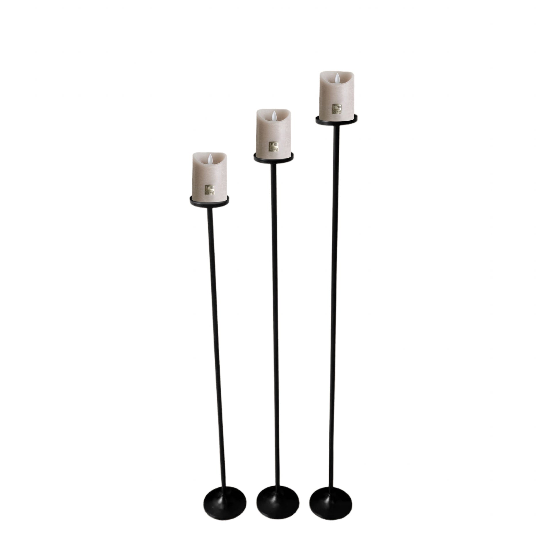 De bekende Onah kandelaar is here!. Deze stijlvolle set vindt zijn plekje in ieder interieur. De kandelaren voor stompkaarsen zijn robuust door de stevige en stabiele voet. De kandelaren zijn zwart van kleur en in drie verschillende hoogtes; 100,110 en 120 cm. Alleen verkrijgbaar per set van 3.